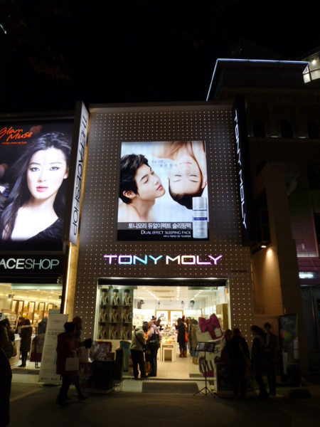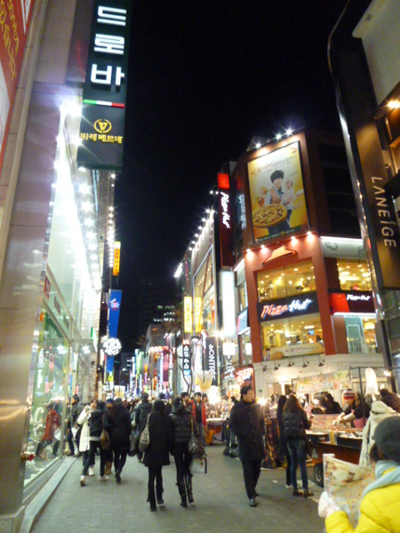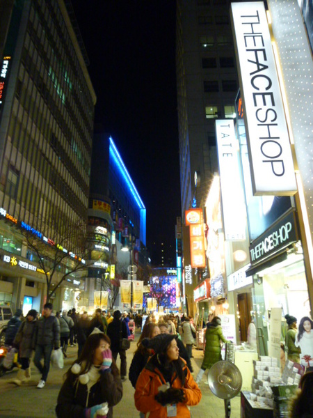 吃飽飯當然就要逛街,明洞其實很像西門町,這裡最多的就是攤販跟彩粧店,因為剛吃飽所以對路邊攤雖有興趣,卻也不想吃了,趕緊找到金賢重代言的彩粧店tonymoly衝進去,迎面而來就是會說中文的東北姑娘,果然這邊很多中國跟台灣人出沒,店家聰明知道這樣就可以賺到錢,買了蕃茄美白面膜跟bb霜,還有送很多贈品,接著又去rain代言的nature republic,在那裡又買了面膜數十枚,得到不少贈品;接著逛逛uniqlo,幫貓老公買了衣服,就要打道回飯店了,在明洞冒險的夜晚很快就結束,明天又是怎麼樣的一天在等著我們呢?敬請期待...