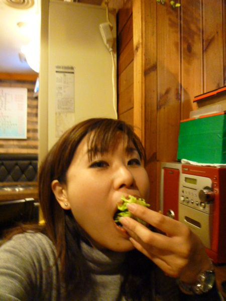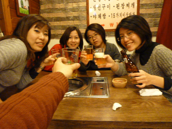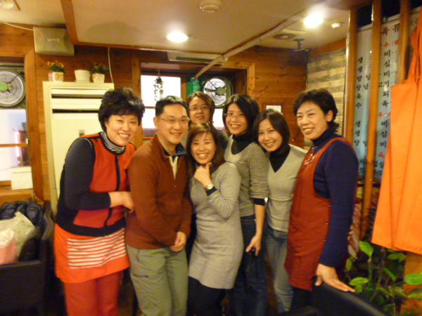 當大家都吃飽喝足之後,阿珠嬷又跑來問我們要不要喝咖啡,又是撒必司,我們當然點頭說好,要結帳前,我記得我們拿的地圖上有折價券,我們給人家吃了喝了那麼多撒必司,不知道折價券還可不可以用,叫貓老公拿折價券去結帳,沒想到真的又打折,總共是20萬韓圜,這一餐雖然比較貴,但是有當大爺被當上賓招待的感覺,一掃之前對韓國人服務差的印象,阿珠嬷一見我們在穿外套戴帽子手套圍巾,又拿著熱的烏龍茶罐來給我們,真的就甘心!臨走前跟阿珠嬷一起拍張照,謝謝她給我們這一餐留下這麼愉快的回憶!