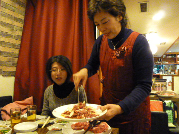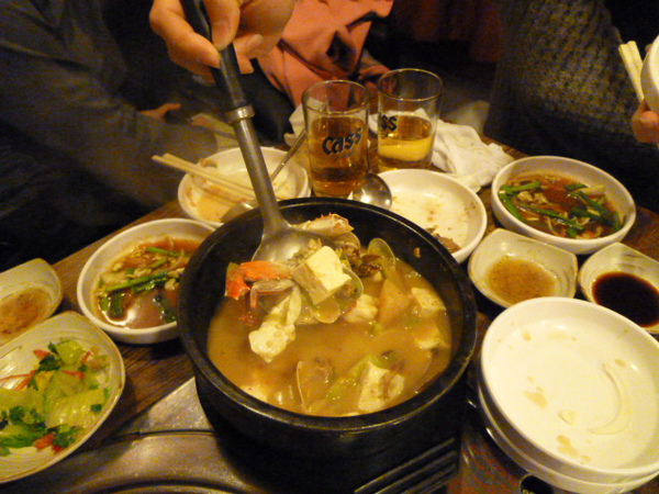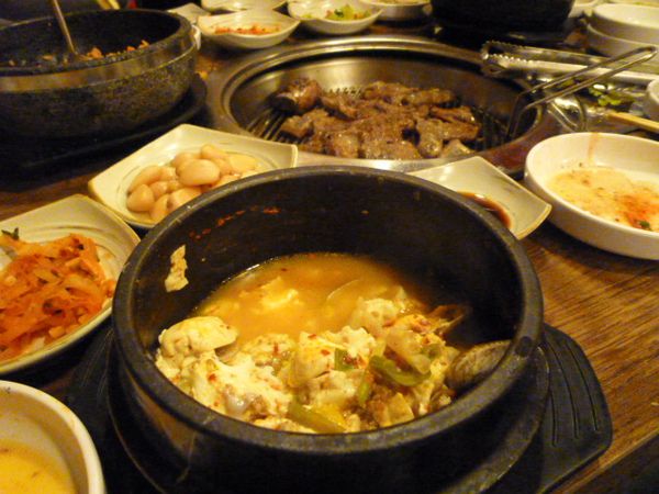 從我們住的飯店到明洞,有一段距離大約是30分鐘左右的車程,出地鐵馬上就感受到冷!想要趕緊找一家店吃飯,但是店那麼多家,不知道要去哪一家好,後來決定就選地圖上有折價券的「韓牛村」,這裡又遇到第二個難題,明明廣告上有寫日本語可以通,老闆娘卻不太會說日文,一直講韓文,我們用中文、日文、比手劃腳溝通很久,才搞定菜單上的意思,於是我們決定砸大錢吃烤肉,點了23萬韓圜的套餐,包含牛排、帶骨牛小排、醃漬牛小排、牛五花四種肉,附餐選涼拌生牛肉、石鍋拌飯、豆腐鍋,還有附送4杯飲料。