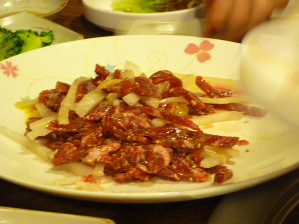 這一盤就是涼拌生牛肉,之前就聽韓國朋友說,一直沒機會吃,因為要肉新鮮才能作,主要是加了水梨、蛋黃、麻油一起拌生牛肉,吃起來沒有腥味,又有水梨甜甜的味道,真的很棒!